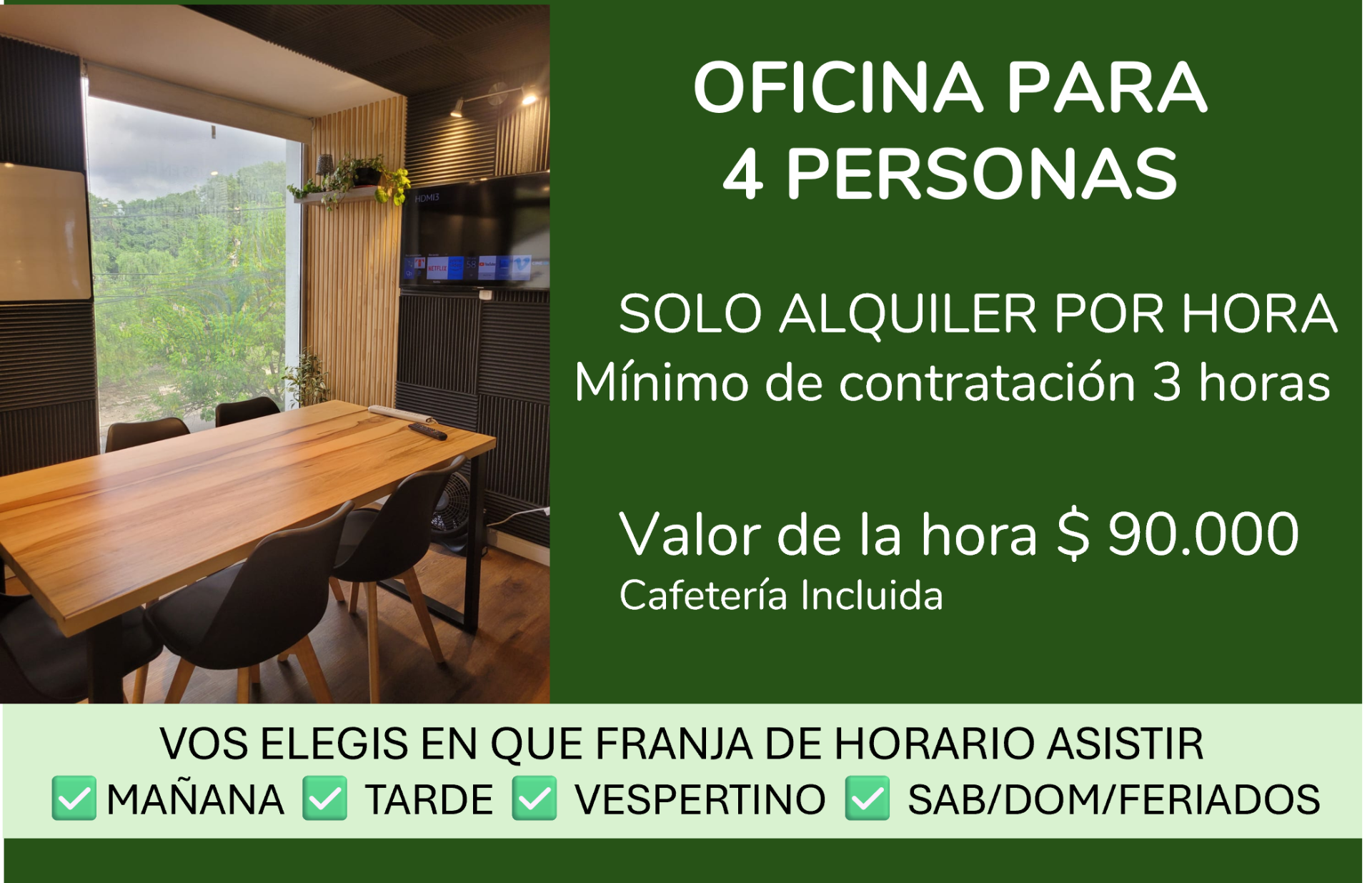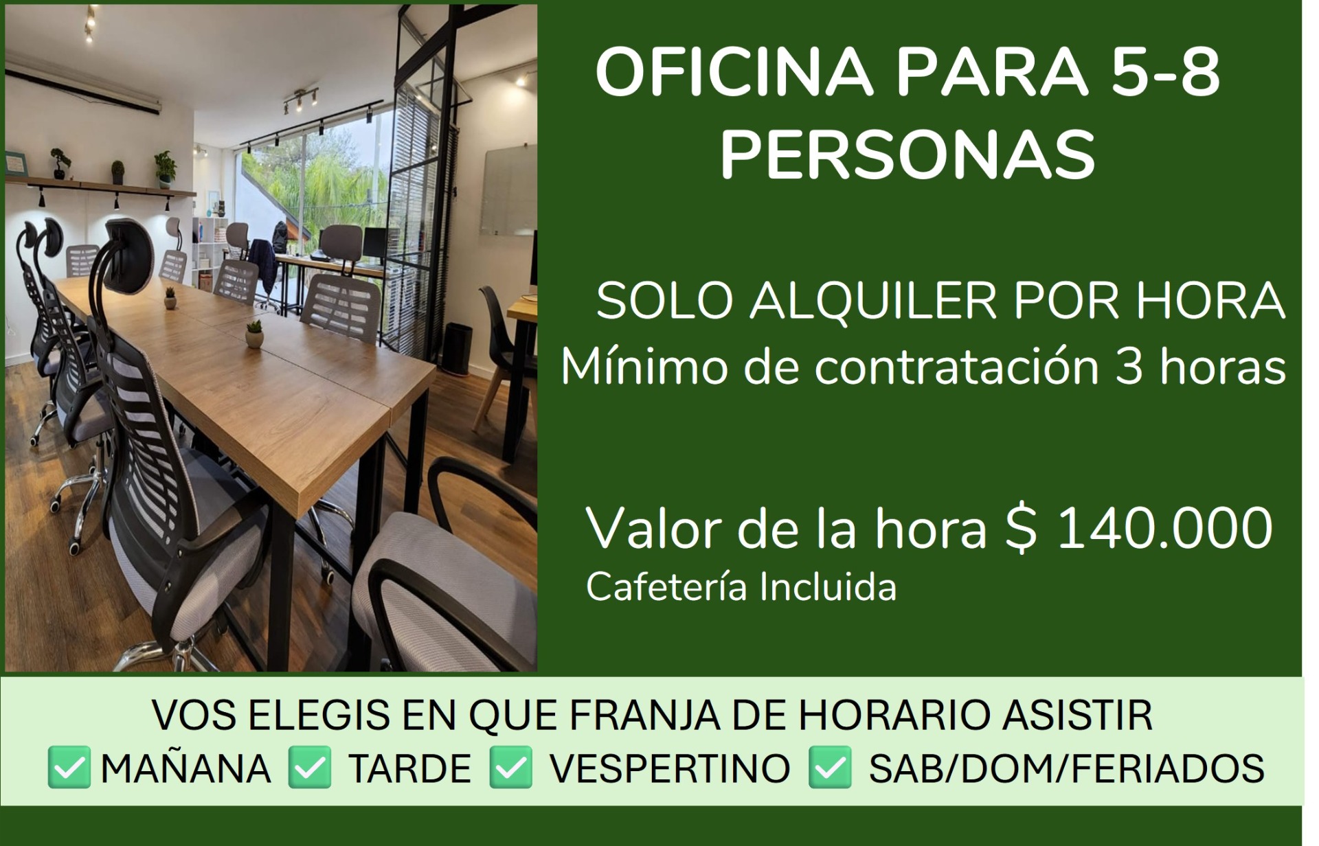 3️⃣ Café incluido: Al contratar en un mínimo de 3 horas, disfruta de nuestro servicio de cafetería sin costo adicional.